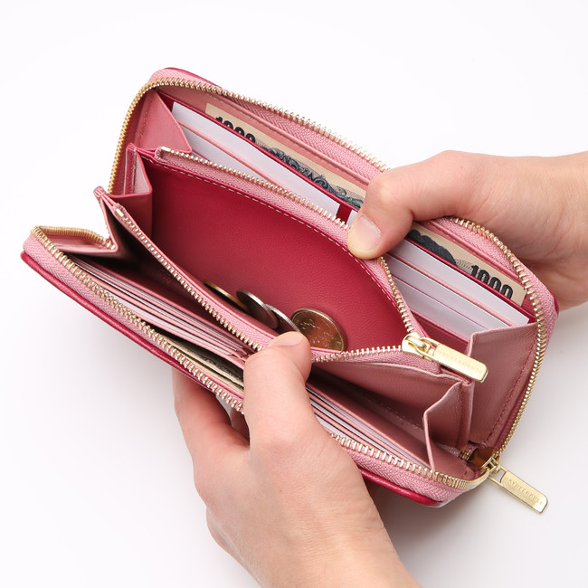 内側の小銭入れまで革を贅沢に使用。また裏地にはスエード調の生地を使い、高級感のある仕上がりです。マチが広く設計されているので、大きく開き、中身が見やすく取り出しやすい構造となっています。