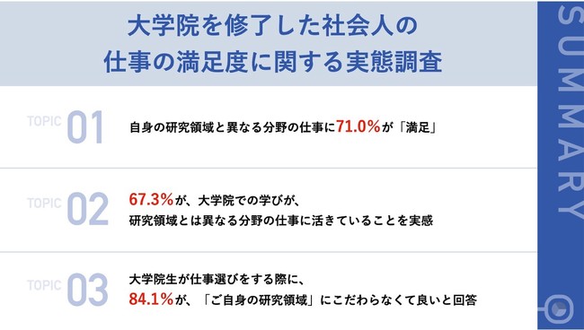就職活動を行う中で、研究領域と異なる分野に就職して、「結果として専門知識が活きた」などといった理由から満足している大学院修了者が多数いることがわかりました。