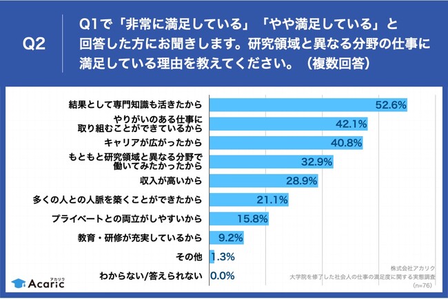 Q1で「非常に満足している」「やや満足している」と回答した方に、「Q2.研究領域と異なる分野の仕事に満足している理由を教えてください。(複数回答)」(n=76)と質問したところ、「結果として専門知識も活きたから」が52.6%、「やりがいのある仕事に取り組むことができているから」が42.1%、「キャリアが広がったから」が40.8%という回答となりました。