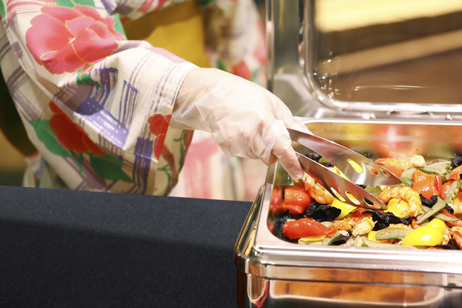 また、お客様同士の感染防止対策として、レストラン入口でお客様全員に使い捨てビニール手袋を配布し、お料理・お飲み物をお取りいただく際の完全着用をお願いしております。業界のガイドラインを遵守し、さらに感染症専門医に監修いただいた、おいしく楽しい 「大江戸温泉物語式あんしんバイキング」 をご提供いたします。