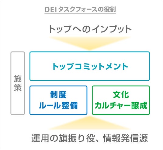 2023年6月よりグループ社員により構成されるDEIタスクフォースを設置し、「トップコミットメント」のもと、「制度・ルール整備」「文化・カルチャー醸成」の両輪で施策を検討・実施しています。