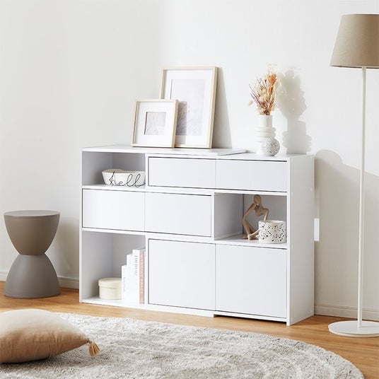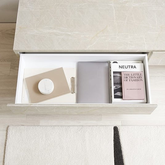 さらに見た目の美しさだけではなく、機能面も充実。シンメトリーが映える左右の収納があり、右側にはフラップ扉の収納を、左側には引き出し収納をご用意。引き出し収納は奥の物まで取り出しやすいフルオープン設計で、リビングに散らかりがちな小物類もすっきりと収納できます。