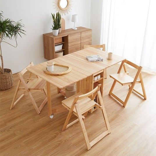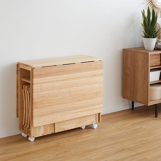 天板を広げると大人4人でもゆったりくつろげるサイズ感(140×80cm)に、人数分のチェア付き。使わない時はテーブルはもちろんチェアもスリムに収納できて、なんと..全幅34cmに!