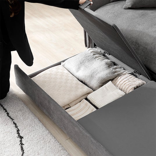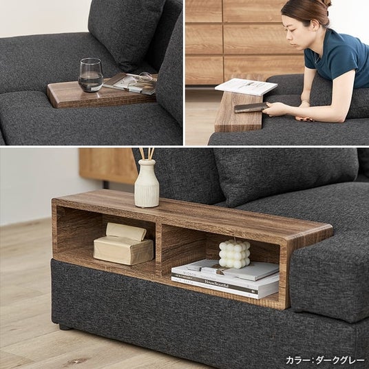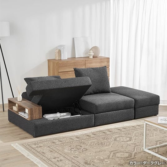 さらに、全てのソファの座面下には収納スペースがあるので、日用品のストックや、衣替えの衣類などを隠せるのも嬉しいポイント。カウチソファスタイルからベッドスタイルまで、3つのソファは単体でも使用できるので、シーンに合わせた組み換えスタイルでくつろげます!そして、オリジナル開発だからこそ、サイドテーブルのようにつかえる木目部分まで、高級感漂うデザインと質感に仕上げています。