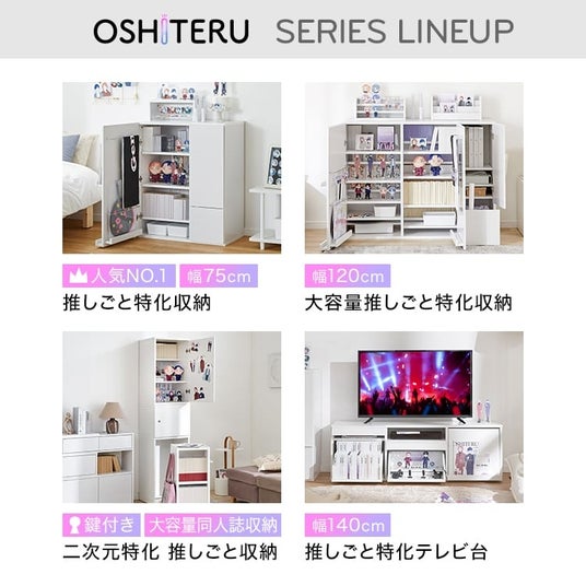 そんな推し活中のアナタにぴったりの収納家具として人気なのが、LOWYAの「OSHITERU」シリーズ。販売開始以降SNSで話題となり、いまではSNS累計3,222万回(※)再生を達成するなど、推し活に励むお客様にご好評いただいている「OSHITERU」は、現在「収納棚」のみならず「ベッド」や「テレビ台」など、バリエーション豊富に展開中。ホワイトを基調としたシンプルなデザインで、インテリアにも馴染むオリジナル商品です。