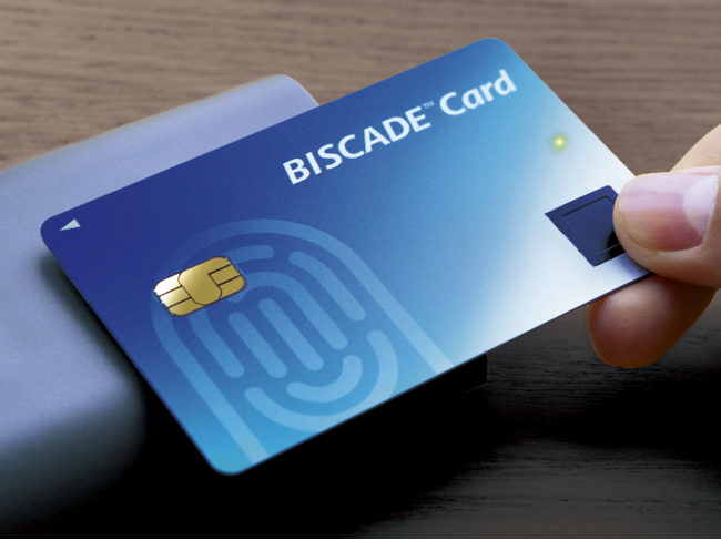 BISCADEは、指紋等人を認証するセキュリティデバイスです。所持と生体の多要素で行う本人確認をカード/ドングルで実現でき、なりすましの防止やワンタッチの指紋認証など、セキュリティと利便性が向上します。