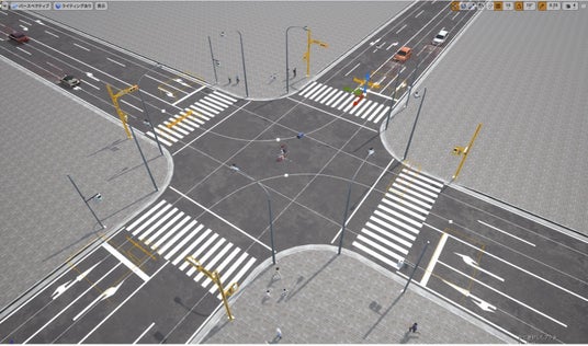 作成したシーンには、自動走行するための走行ルートパスと車両の挙動モデルを実装しました。そのため、自車と他車、並びに他車同士が衝突することなく物理シミュレーションによって自動走行する様子を確認することができるようになっています。