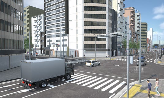 このたび当社が日野自動車の委託を受け開発、提供した走行シミュレーターは、米Epic Games社のゲームエンジン※「Unreal Engine(アンリアルエンジン)」を使用して開発されました。仮想空間で実際の交通ルールや対向車の影響などを考慮しながら走行する自車をデザイン評価することができるものです。