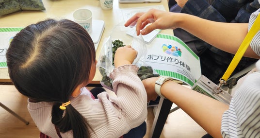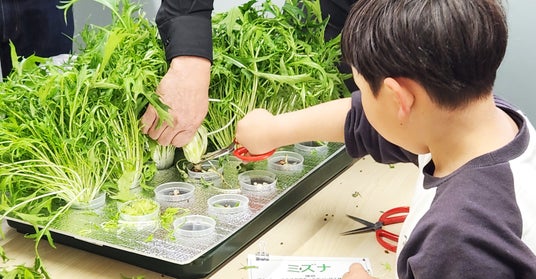 IBUKIで栽培された野菜の収穫体験が行われました。水耕栽培のためクリーンな環境で育てられた野菜を収穫したまま、お持ち帰りいただきました。また、IBUKIの成果物の一つであるポプリ作り体験も行われました。
