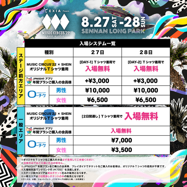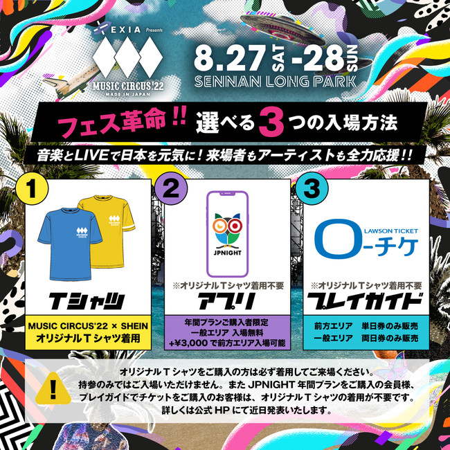7月1日(金)12:00より、SHEIN(シーイン)公式販売ページから購入できる「MUSIC CIRCUS’22×SHEINオリジナルTシャツ」着用で、8月27日(土)・28日(日)大阪・SENNAN LONG PARK(泉南りんくう公園)にて開催される音楽フェスティバル「EXIA Presents MUSIC CIRCUS’22」に無料でご入場いただけます。(※別途1ドリンク¥700必要)予定枚数が売切れ次第、販売終了となります。お早めにお買い求めください。