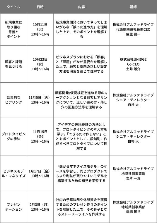 この度、新規事業開発の専門集団 株式会社アルファドライブ(以下、AlphaDrive)は、近畿エリア企業の新規事業の担当者向けに、半年間の「新規事業開発実践プログラム」を開催致します。