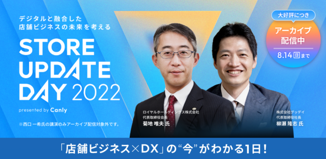 Googleビジネスプロフィール(旧・Googleマイビジネス)・HP・各SNSの一括管理サービス「Canly(カンリー)」の開発・提供を行う株式会社カンリー(所在地:東京都渋谷区、代表取締役:辰巳 衛,秋山 祐太朗)主催の店舗運営者向けのオンラインカンファレンス『Store Update Day 2022~デジタルと融合した店舗ビジネスの未来を考える~』を、8/14(水)まで限定でアーカイブ配信することとなりましたので、ご案内します。