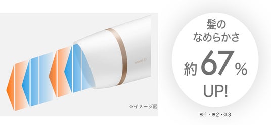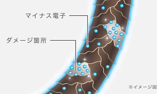 スムーズEXフィルターより放出されるマイナス電子がヘアダメージ部に付着することで、髪の水分の放出・付加を防ぎ、髪のダメージ(老化=酸化)を低減、キューティクルを整えることで、髪にツヤとなめらかさをプラス。