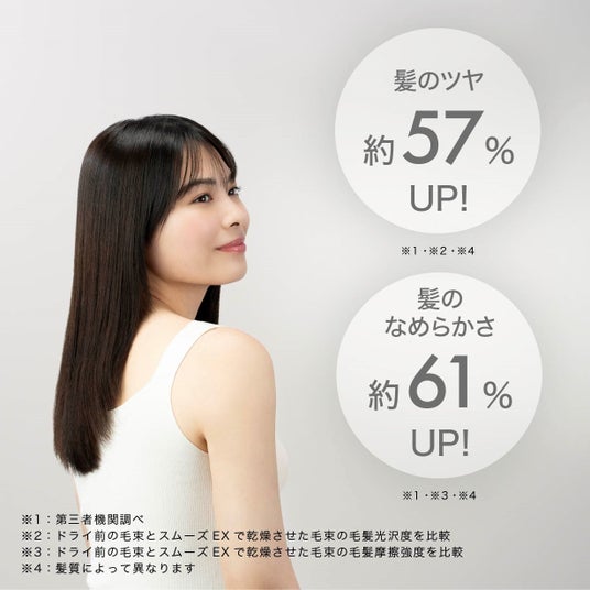 ※️1第三者機関調べ ※2スムーズEXのサロンモードで乾燥した毛束と未処理の毛束の毛髪摩擦強度を比較 ※3髪質によって異なります