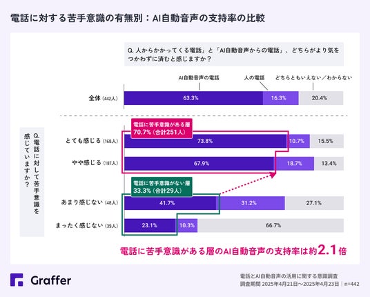 企業・行政機関における業務のデジタル変革を手掛ける株式会社グラファー(本社:東京都渋谷区、代表取締役:石井大地、以下「当社」)は、12月16日の「電話創業の日」に先駆け、社会人1~5年目のZ世代社員442人を対象に、電話とAI自動音声の活用に関する意識調査を実施しました。これにより、電話に対する苦手意識が強いことや、AIを活用した電話応答に対する高い期待が明らかになりました。