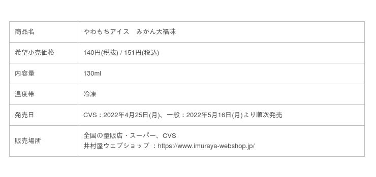 井村屋株式会社(本社:三重県津市高茶屋七丁目1番1号、社長:岩本 康)は、アイスの新商品として『やわもちアイス みかん大福味』を2022年4月25日(月)よりCVS先行にて、全国で順次発売します。