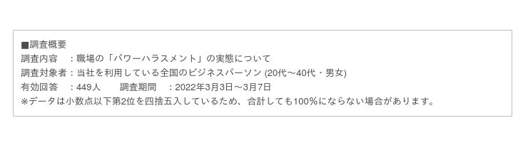 2020年6月1日から「パワハラ防止関連法」が施行され、大企業でパワハラ防止策が義務化されましたが、この4月からは中小企業にも防止措置が義務付けられます。そんな中で、現役ビジネスパーソンの職場ではどれぐらいパワハラが起きているのか、防止策が進んでいるのかなど、現時点での「パワーハラスメント」の実態について調査しました。