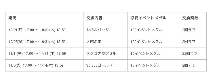 イベントメダルで交換可能なアイテムが期間限定で登場します。とてもお得に交換できますので、このチャンスをお見逃しなく!