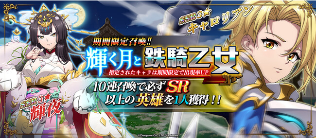 『輝く月と鉄騎乙女』は10連召喚で必ずSR以上の英雄を一人獲得できる、期間限定召喚です。SSRキャロリアン、SSR輝夜の出現確率が期間限定でアップします。