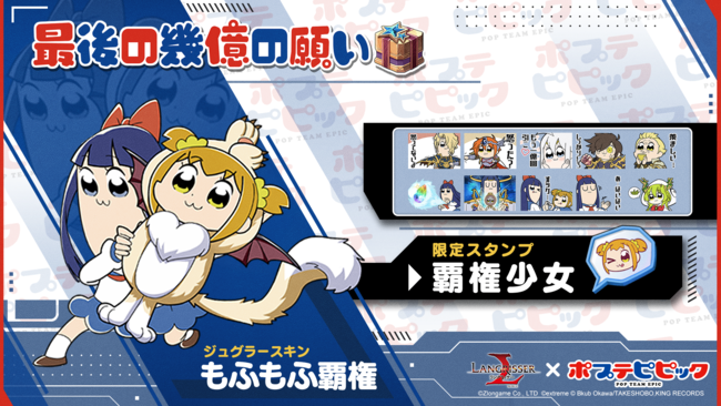 さらにSSR英雄ジュグラー専用スキン「もふもふ覇権」を購入・着せ替えると、ジュグラーがポプ子とピピ美に変身!ランモバでしか聞くことのできないスペシャルボイスを堪能できます。