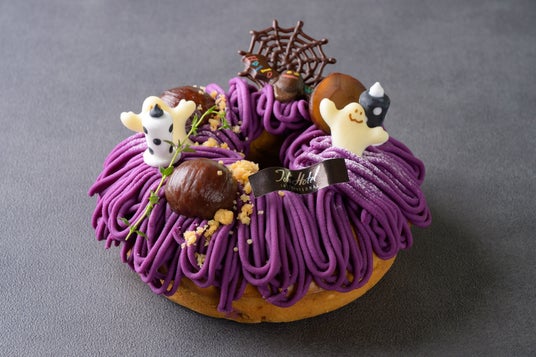 そのほか、ホテルショップでは、土日祝限定でハロウィンをイメージしたケーキ「ハロウィンナイト」をご用意。サツマイモペーストを練り込んだ生地に角切りのりんごやサツマイモ、クルミをちりばめてリング状に焼き上げ、その上に華やかな紫芋をモンブラン風に仕上げ、栗の渋皮煮やオバケのチョコがトッピングされています。