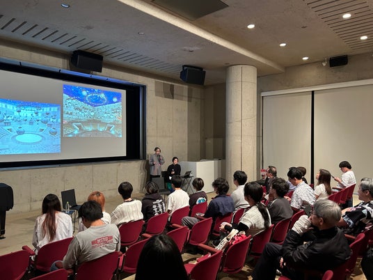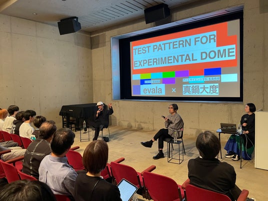 また、アーティストとしてドーム型環境下での創作の可能性や、実験ドームをどう活用していくかを聞かれると、evala氏は「ドーム型の場合、音が中心に集まり立体的に聴こえづらいため、空間音響を学ぶ環境としてはむしろ適している。実験ドームは床が沈む構造になっているため、その構造を活用して洞穴から音と光が放射される作品実験をしてみたい。」とお話しされました。真鍋氏からは「今回は多くの方々に観ていただくものでしたが、1日中寝転がってゆったり観られるような作品をつくりたいと思いますし、自分自身も体験したい。」とコメントをいただき、「いいですね、次が決まりましたね!」とevala氏から賛同の声が上がりました。