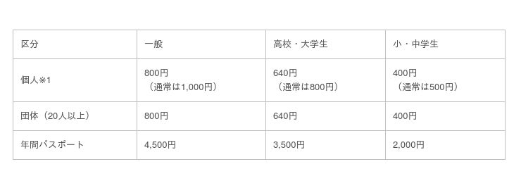 ミュージアム通常入館料と同額になります(2021年度限定割引料金適用)。