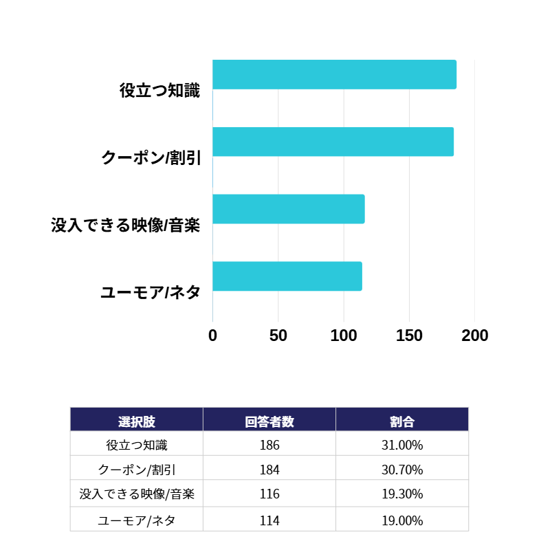 今回の調査では、Z世代が広告に求める要素として、「クーポン/割引」が30.7%、「役立つ知識」が31.0%と、約3割の回答者が実用性を重視していることが明らかになりました。一方、「ユーモア/ネタ」は19.0%、「没入できる映像/音楽」は19.3%に留まり、単なるエンターテイメント性や体験型コンテンツよりも、直接的なメリットや情報価値を重視するZ世代の消費行動が浮き彫りになりました。この結果は、広告戦略において、Z世代の関心を引くためには、具体的な利益や実用的な情報提供が不可欠であることを示唆しています。