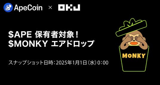 「Wise Monkey (MONKY) 」が、エイプコイン(APE)保有者に対して、新規発行予定トークン『MONKY』のエアドロップ(無料配布)を発表したことを受け、OKJは同社と連携して、APEホルダー向けにOKJ独自のエアドロップを実施します。所定時点にスナップショットを実施し、APE保有量に基づきお客様へ『MONKY』をエアドロップします。