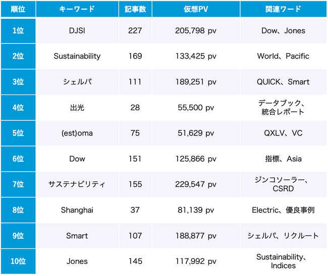 1位の「DJSI」は、世界的なESG投資の株式指数のひとつである「Dow Jones Sustainability Indices」の略称です。投資家が投資先の企業の持続可能性への取り組みを評価する際の重要な基準となっています。これに選定された企業の情報が12月中旬以降に多く出ています。