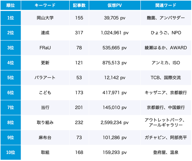 9位は「麻布台ヒルズ」のSDGsの話題。Snow Manの阿部亮平さんが、フジテレビ系ニュース番組でガチャピンとともに麻布台ヒルズを訪れSDGsの取り組みを取材しました。『ORICON NEWS』『 Real Sound』など芸能・カルチャーニュースのサイト、『TVガイド』などのテレビ情報サイトが取り上げ、多くの記事数とPVを得ています。