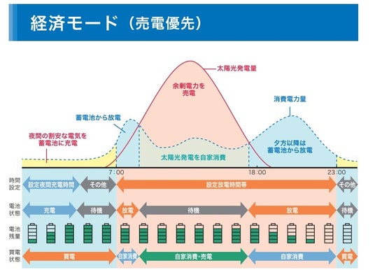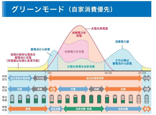 MPPTシャドウスキャン機能を搭載し、太陽光パネルの一部に影がかかっても最適な発電量に制御します。また、自家消費優先の「グリーンモード」、売電優先の「経済モード」、非常時に備えた「安心モード」の中から、太陽光発電の売電単価や電気料金メニューに応じて最適な運転モードを選ぶことができます。