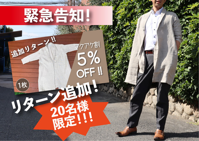 【残り二日!追加リターン決定】アタラシイものや体験の応援購入サービス「Makuake(マクアケ)」にて、創業75周年を迎える大阪・泉州のタオルメーカー株式会社成願が、お家でも外でも羽織るだけで決まる!麻100%ワンマイルウェアを先行販売中!これからの季節にピッタリの一枚をこの機会にお買い逃しなく!