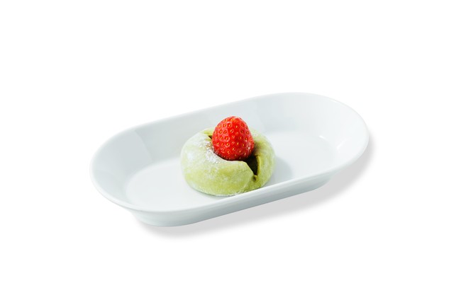 もちもちの抹茶大福の真ん中にいちごをはさんだ、見た目もかわいらしい大福。