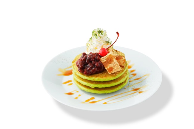 わらび餅やあずき、黒蜜と一緒に味わう抹茶のパンケーキ。ホイップクリームをたっぷりつけて召し上がれ。