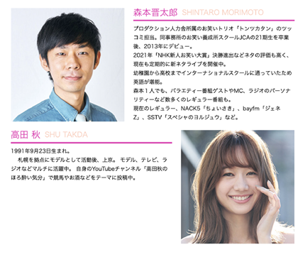 パーソナリティの森本晋太郎(トンツカタン)と高田秋が月曜日からの「グルメ、映画、音楽、スポット」など1週間分のトレンド情報を3時間でちょっと先取りしてお届けする番組。