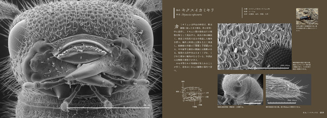虫体・構造が観察しやすいように、電子顕微鏡写真はあえてモノクロにしています。種ごとにフルカラーの写真とイラスト解説もあるので、虫の全体像がわかります。