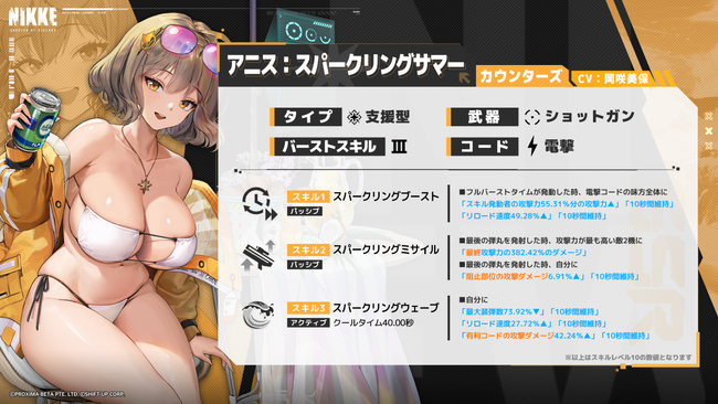 「アニス:スパークリングサマー」は電撃コードのニケの攻撃を補助するのと同時に自分も強くなるニケです。