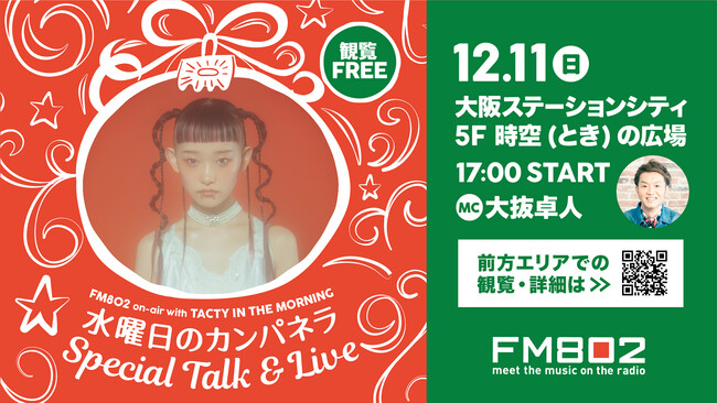 12/11(日)大阪ステーションシティ・5F時空(とき)の広場で水曜日のカンパネラを招いて公開収録を開催します。この公開収録に50組100名様ご招待いたします。3年ぶりのイルミネーション「Twilight Fantasy」で彩られた大阪ステーションシティ・5F 時空(とき)の広場にてon-air with TACTY IN THE MORNINGが贈るスペシャルTALK&LIVEにぜひお越しください。