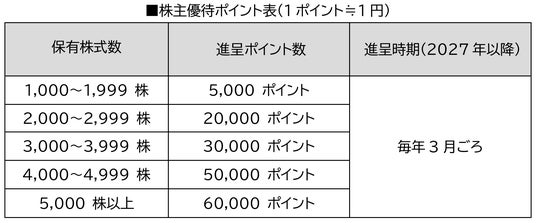 【進呈条件】2026年12月末以降、毎年12月末日の当社株主名簿に記録または記載された 1,000株以上保有の株主様として記載または記録されること。