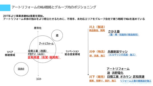 今回の匠和美建社のグループインは郊外エリアの地域戦略となります。匠和美建社は、1995年に創業し、30年間佐賀県佐賀市、並びに福岡県筑紫野市にて地域密着型のスタイルでリフォームのサービスを提供してきました。2012年以来ずっと佐賀、福岡エリアでLIXILリフォームコンテストにてNo.1という表彰をいただき続けています。アートリフォーム福岡支店と合わせて、グループ全体として西日本並びに九州エリアのサービスを拡充します。