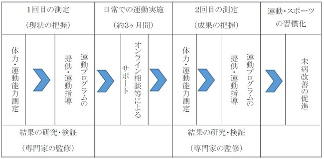 体力や運動能力を測定し、その結果を基に個別の運動プログラムを作成します。3ヶ月間運動を継続した後、2回目の計測を行い、どのような変化が起きるか…。現状と課題、その成果を把握し、運動の習慣化を目指しましょう。3ヶ月の間にはオンライン相談によるサポートも受けることができます。
