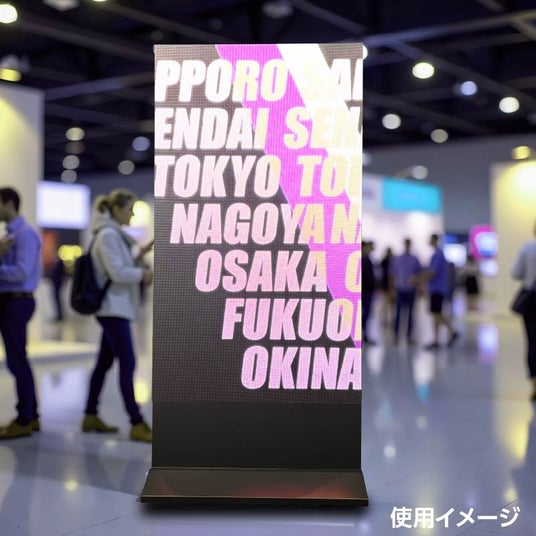 本体は縦型の自立式構造を採用。省スペースでも十分な表示面積を確保でき、店頭プロモーションや商品紹介、キャンペーン告知など、多様な用途で高い効果を発揮します。