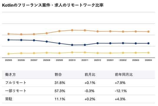 2026年4月時点のKotlin向けフリーランス案件・求人におけるリモートワーク比率は、フルリモートが31.6%、一部リモートが57.3%、常駐が11.1%となっています。