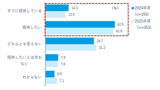 ドローン活用で「何かしらのデータを取得している」と回答した266名を対象に、取得したデータや解析結果を他のサービスや行政システムとつなぐ「データ連携基盤」や「都市OS」などを介して外部に提供することについて聞いたところ、14.3%が「すでに提供している」と回答しました。「提供したい」の42.5%と合わせると半数以上が外部への提供に積極的であることが明らかになりました。