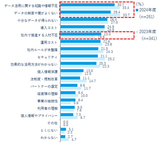 - データ活用にあたっての課題は知識や情報不足、データの鮮度や質の低さを挙げる声が多い