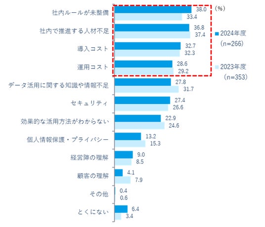 < データ活用にあたって、社内ルールの未整備や人材、コスト、知識の不足を課題と挙げる企業が多い >