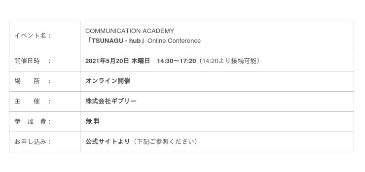 株式会社ギブリー(本社:東京都渋谷区、代表取締役社長:井手 高志、以下ギブリー)は、自社が提供するチャットボット、LINE運用ツールやリモート接客ツールを活用してオンラインでの接客を可能にする3つのサービス(SYNALIO/LIBERO/Virtual Store)のナレッジを元に、オンラインとオフラインの境目がなくなる"OMO"時代において、ユーザの体験価値を向上させるノウハウを発信するマーケティングカンファレンス「COMMUNICATION ACADEMY『TSUNAGU - hub(つなぐ - はぶ)』を2021年5月20日(木)14時20分より開催いたします。