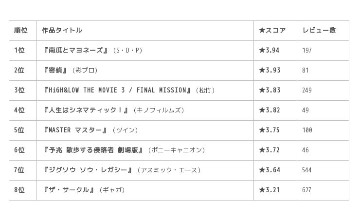 ※本ランキングは公開日から11月13日までの★スコアが3.0以上の作品を対象としています。
