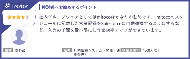 mitocoはカレンダーを始めとするグループウェア機能に高い評価をいただきました。Salesforceとデータ連携できるところは大きな評価ポイントのひとつです。操作性の高さによる業務効率化や、ユーザーを選ばない扱いやすさを実感する声も寄せられています。